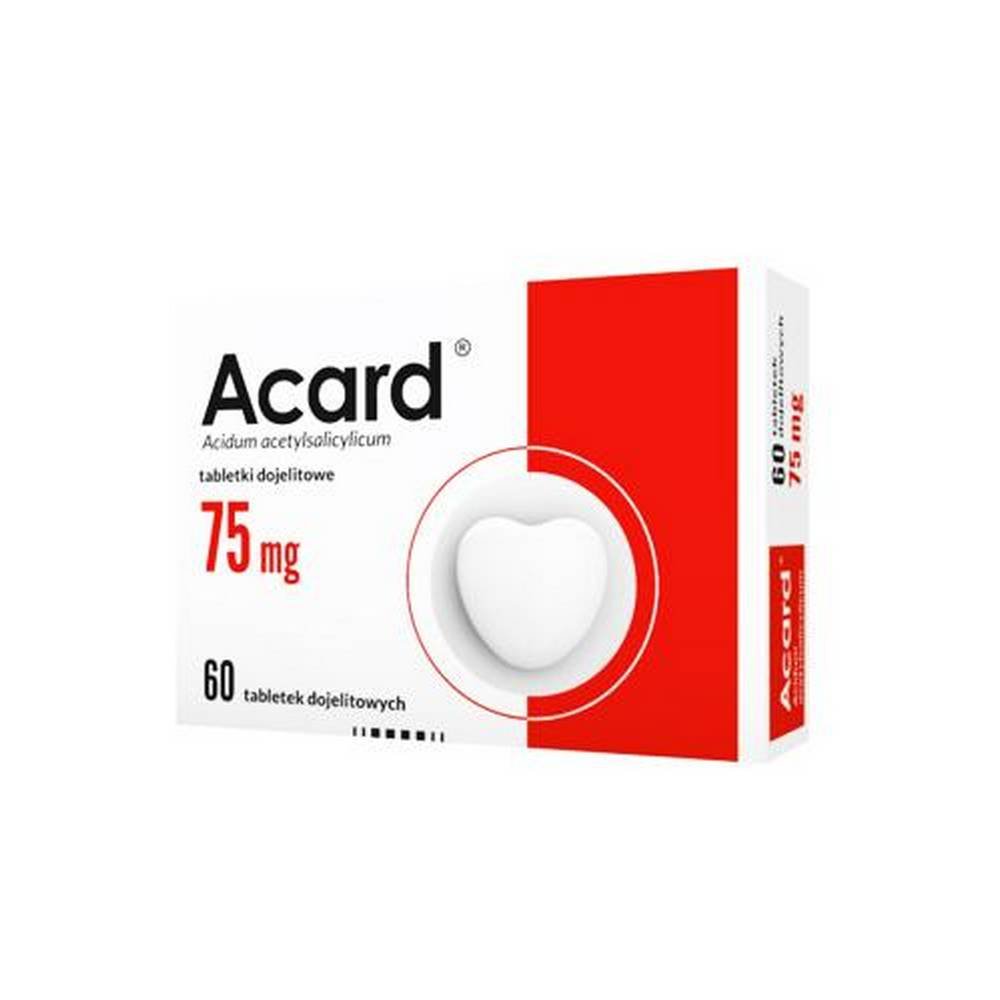 ACARD contient de l’acide acétylsalicylique, qui inhibe l’agrégation plaquettaire. Comprimé en forme de cœur avec un revêtement spécialement conçu, grâce auquel le comprimé ne se désintègre que dans l’intestin grêle, ce qui protège la muqueuse gastrique et duodénale des irritations.
