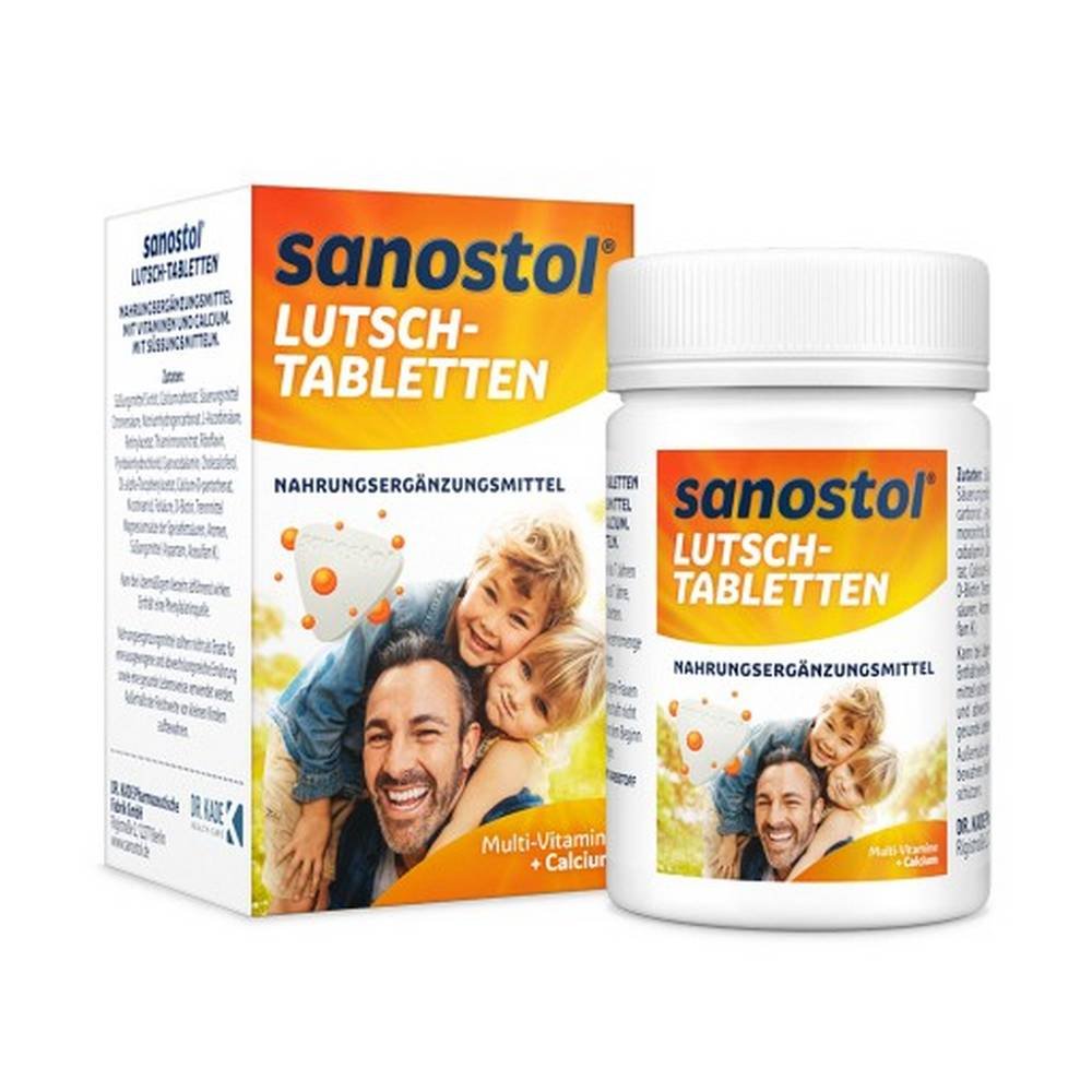 Mit den leckeren Sanostol Lutsch-Tabletten können Sie die tägliche Ernährung sinnvoll ergänzen. Sie enthalten eine sorgfältig abgestimmte Kombination von lebenswichtigen Vitaminen. Zusätzlich enthalten die Sanostol Lutsch-Tabletten Calcium und Vitamin D zum Erhalt normaler Knochen und Zähne. Sanostol Lutsch-Tabletten schmecken Jung und Alt und prickeln toll im Mund. Sanostol Lutsch-Tabletten sind zuckerfrei und glutenfrei.