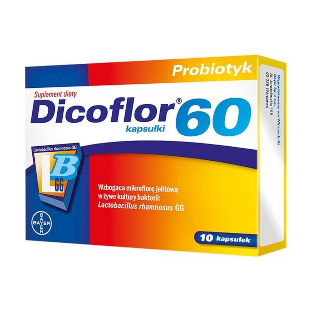Dicoflor 60 pour compléter diety w postaci kapsułek zawierający liofilizowane, żywe kultury bakterii Lactobacillus rhamnosus GG.